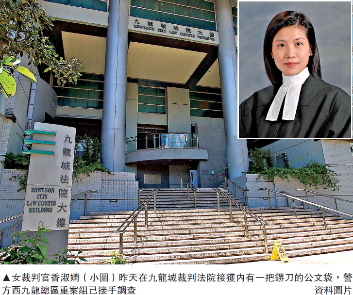 圖:女裁判官香淑嫻(小圖)昨天在九龍城裁判法院接獲內有一把鎅刀的公文袋,警方西九龍總區重案組已接手調查 /資料圖片