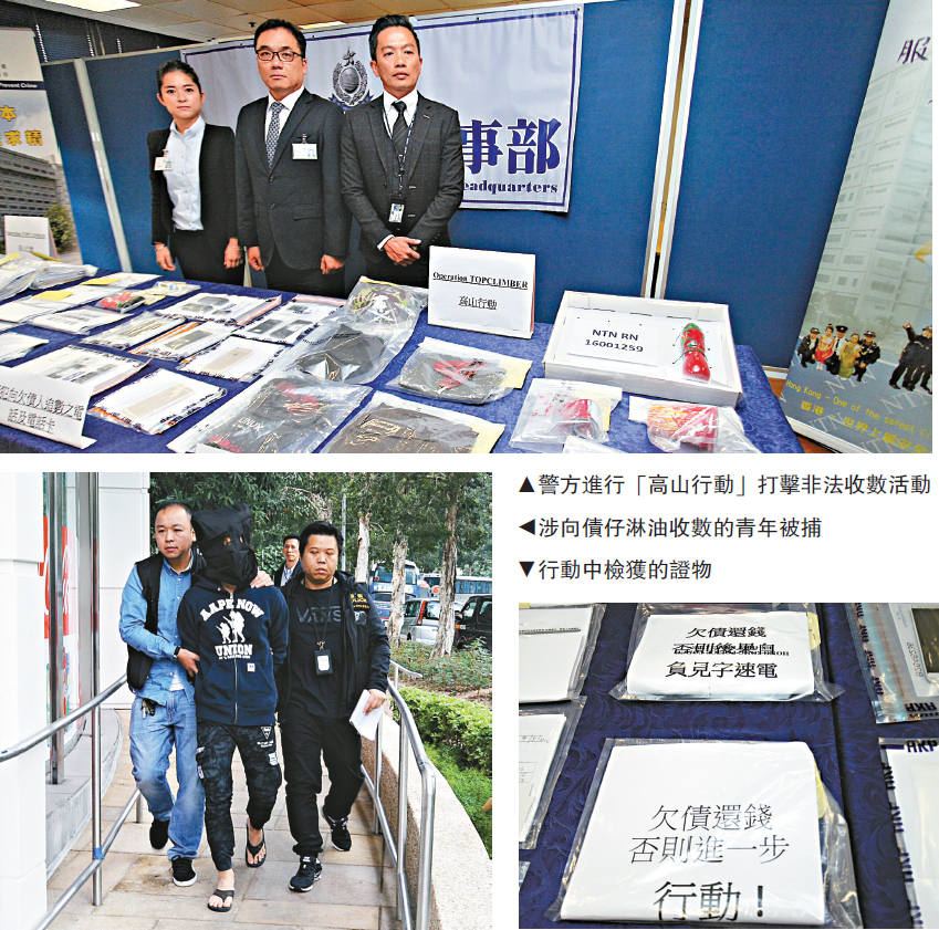□警方為打擊不法收債活動,前日起一連兩日派出探員搜查九龍及新界多處地點,共拘捕八人,涉嫌與區內十宗收債刑毀案有關,當中三名「收數佬」為學生及輟學少年,最細只得14歲。三人流連娛樂場所誤交損友,為賺取數百元報酬,替不法中介及黑幫收數,其間以淋油、張貼大字報及襲擊等非法手段追數。/大公報記者 周慶邦