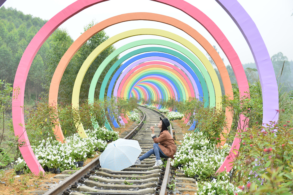 走進廣西「百年煤都」合山,七公里長的鐵路上搭建了一條七彩長廊,把廢棄多年的廣西第一條鐵路裝飾一新,七色拱門的透視感形成了一道陸地彩虹,絢爛奪目,浪漫溫馨。沿路樹林蒼翠、花團錦簇、景色優美,騎着敞篷鐵路自行車穿行,似乎行走在烏克蘭克萊文鎮「愛情隧道」。