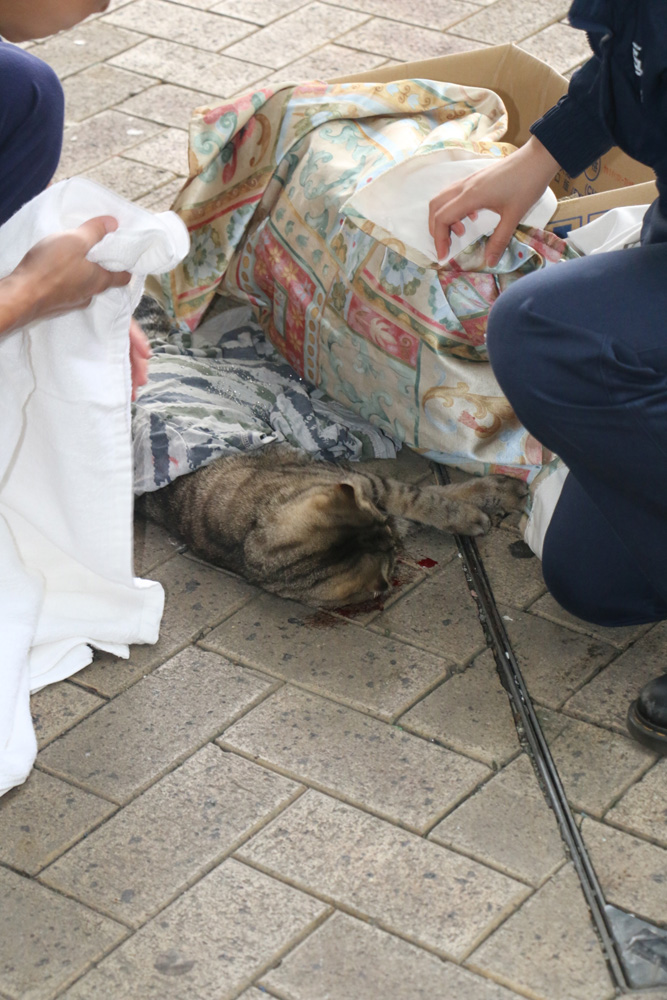 救護員接報到場將唐婦送院,她右邊膊頭、右腳掌受輕傷,經敷治後無大礙,但已飽吃「驚風散」。警方即時通知愛護動物協會人員到場,確認該隻為約呎半長英國短毛摺耳貓。貓貓由愛協人員帶走,經獸醫檢查後最終要人道毀滅。警方未知貓貓從哪層樓墮下,以及貓主身份,將案件列作「有人意外受傷」及「發現受傷動物」處理。