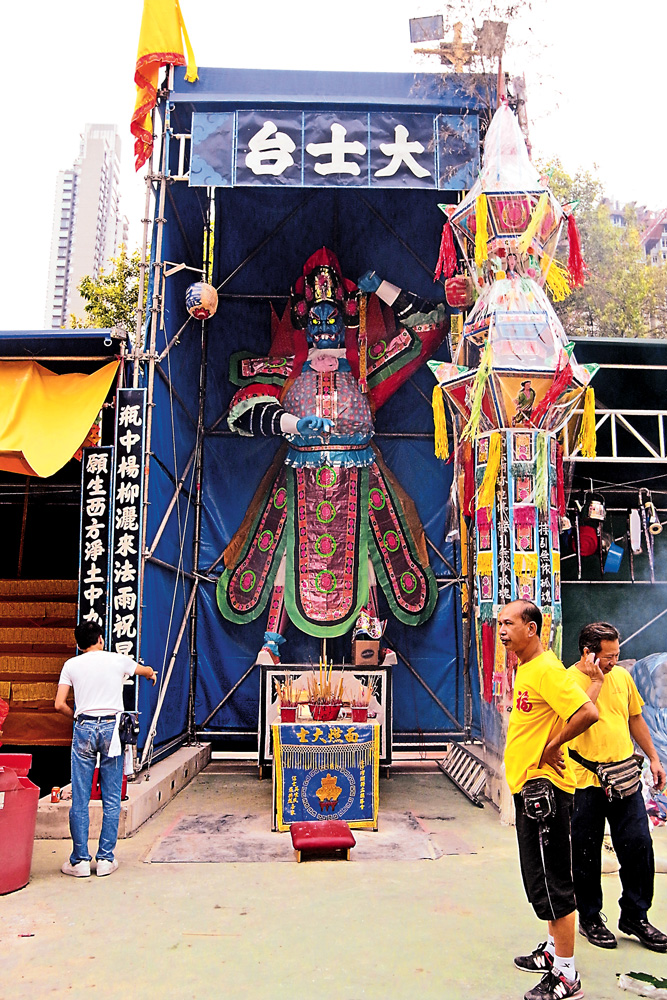 講座完畢後,記者隨胡炎松深入了解正在該球場舉行的長沙灣潮人盂蘭勝會。記者環顧會場,看見內有上演着「神功戲」的戲台、一眾僧人念誦經文的「經師棚」、擺滿祭品和糧食的「天地父母棚」與「米棚」、代表維持法場秩序的兩層樓高「大士王」、把捐助者名號送達天庭的紙紮紅馬等元素,構成了整個勝會。