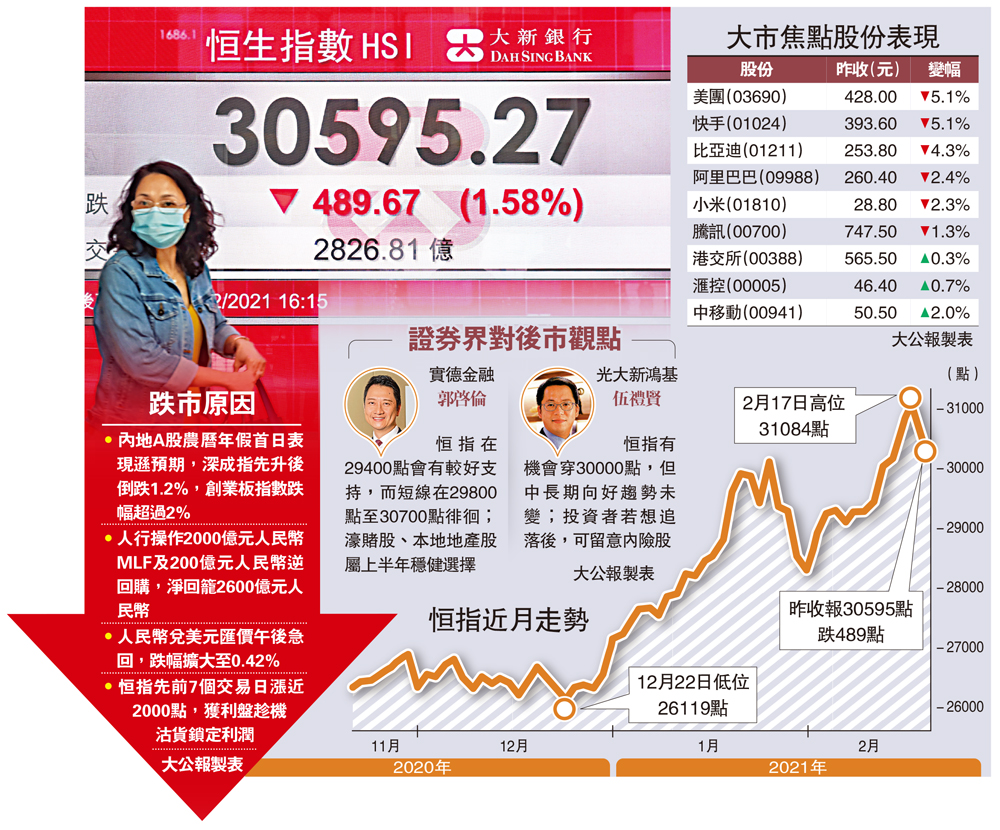 內地A股農曆年假後走勢不如預期,熱錢大舉撤退,恒指反覆跌489點,連升7日紀錄斷纜。炒家要錢不要貨,主板交投急增36%,達到2826億元。美股早段跌近1%,拖累恒指夜期再跌200點,最低見30170點。展望後市,證券界人士預期,恒指短線恐會跌穿三萬點關,但進一步向下空間有限;投資者若想追落後,可留意內險股。\大公報記者 周寶森