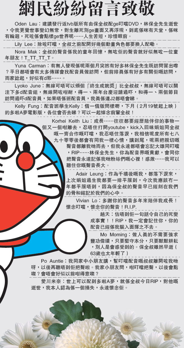 為動畫多啦A夢配音的著名配音員林保全,昨日早上突然離世,終年63歲。自消息傳出後,網上各大討論區及社交論壇都被「洗版」。為靜宜(現稱「靜香」)配音的梁少霞,覺得這位「多啦A夢」離世得太突然,她表示重新人開始,就跟住保全叔學習,非常不捨,她又稱會做好自己本分,延續保全叔那份熱誠、努力工作的精神。無線配音員、在鐵齒銅牙紀曉嵐為乾隆配音的張炳強亦稱,認識保全叔已30多年,更指「尋晚先同佢配緊音,佢夜晚8點幾走,大家講再見,估唔到係最後一次見佢。」