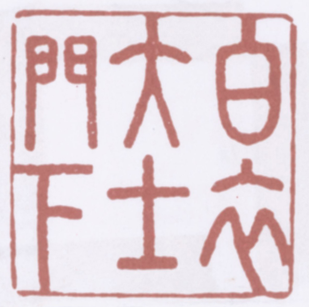 附圖為沈鳳篆刻朱文六字方印《白衣大士門下》,可見其上述秀奇風格。他另刻《林園無世情》和《當中龢天,偕樂易友;吟自在詩,飲歡喜酒。》俱富秦篆韻味。