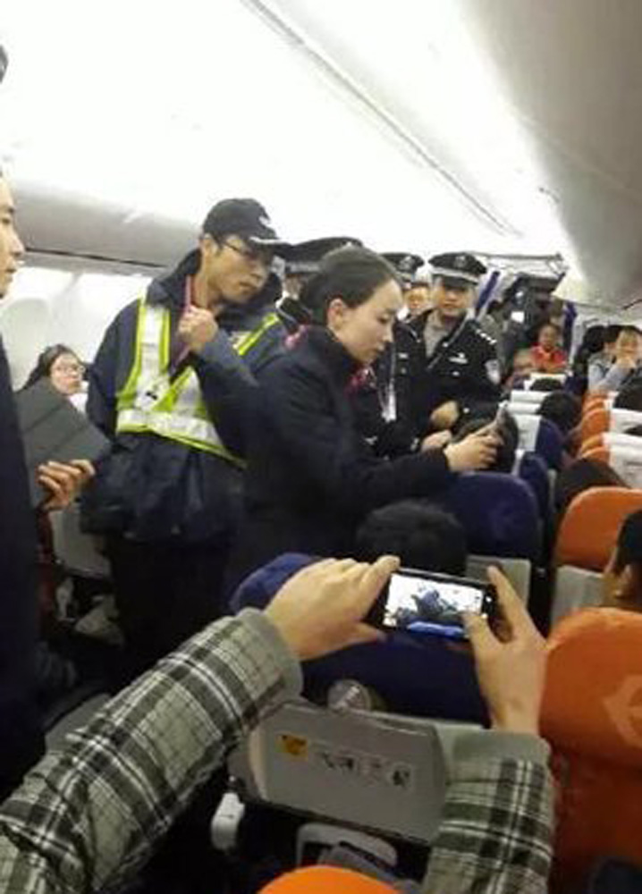 飛機除冰完畢後即開始滑行。滑行過程中,飛機駕駛艙應急出口燈突然亮起,地面機務工程師發現中部應急撤離艙門被人為打開,飛機隨即放棄起飛,25名涉事旅客被機場公安帶走調查。