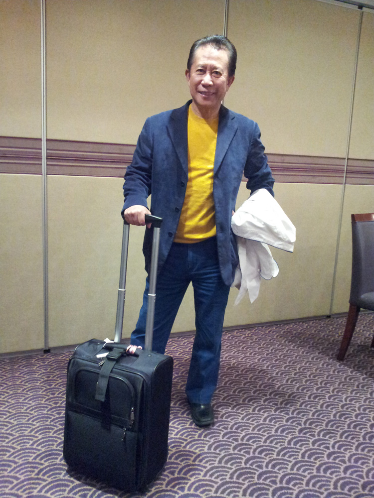 圖:甄文達帶?他的隨身行李滿世界飛,風塵撲撲卻永不言倦