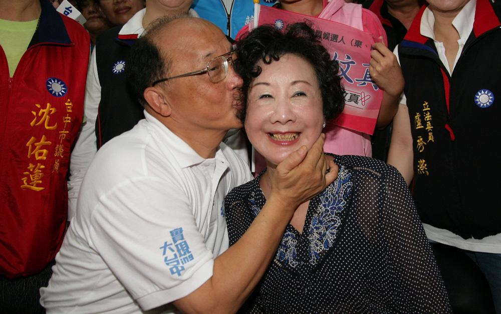 圖:胡志強去年登記參選台中市長後,當場親吻妻子邵曉鈴,感謝她一直陪伴身旁 資料圖片