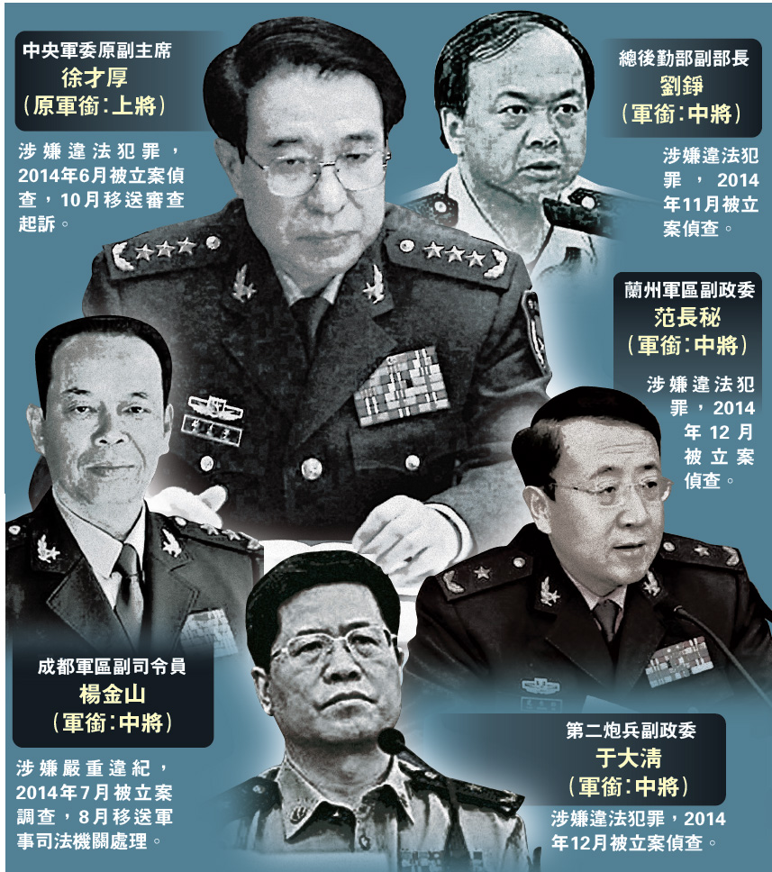 不過,徐才厚的上將軍銜已經被褫奪。其餘人等在經過紀律、法律處分之後,相應軍銜也將取消。