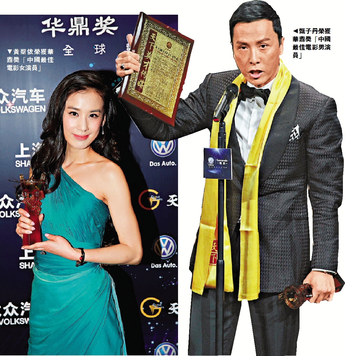 □「第十五屆華鼎獎」昨晚於澳門舉行,「中國最佳電影男演員」及「中國最佳電影女演員」分別由甄子丹及黃聖依奪得,成為華鼎影帝影后;而剛去世的內地女歌手姚貝娜則奪得「中國年度最具人氣歌手」。昨晚紅地毯星光閃閃,不少女星都盛裝赴會,韓國人氣藝人金秀賢出場時,更極受歡迎。