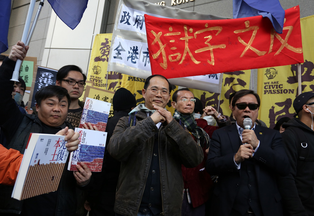 約50名激進的本土派人士在總部外聲援,包括「熱血公民」成員、立法會議員黃毓民、「美國隊長」容先生等。有支持者大肆揮動港英「龍獅旗」聲援。當陳雲抵達警總時,眾人立即拍掌夾道歡迎,黃毓民則帶領他們高呼「撐陳雲、撐國師」、「政治檢控可恥」、「城邦會戰勝歸來」等口號。陳雲聲稱,今日到達警署是證明在網上發表言論也會被捕,顯示言論自由受打壓。他不比較「民族論」和「城邦論」,但給出的理由非常「無厘頭」,稱沒有港大學生在場,比較並不公道。