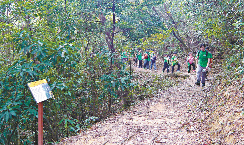 圖:旅途中遇上一群朝氣勃勃的童軍,他們穿?整齊的綠色制服,一邊大步前行,一邊報數,精神抖擻地穿越八仙嶺自然教育徑,向目的地進發