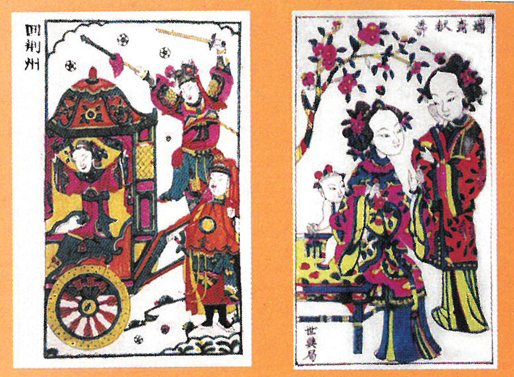 三十多年前,往陝西鳳翔,於城東十里的小里?,得見幾位收藏家所展示一些珍稀舊版樣及戲齣年畫,大開眼界。鳳翔乃我國西北著名年畫產區;清初有不少作坊雕版印畫,以世興畫店邰家字號(已結業)較老,清代舊版甚多。鳳翔刻印套色年畫者,以陳鎮與簫裡村為主;所印戲齣年畫,皆屬墨線版,工藝描繪大多細緻,線條較硬朗。筆者最喜歡其刻法十分古樸,和陝西漢中之版樣一樣古,風格保存原貌;而且留下古代地方戲曲版畫韻味;不少內容為戰國、兩漢、三國、魏晉及唐代至明代各朝歷史及小說中人物。人物動作乃舞台身段,例如《逍遙津》(即曹操《白逼宮》)、《無底洞》(「西遊記」之陷空山)、《李逵奪魚》(「水滸傳」)等墨線版,皆使人過目難忘。附圖為鳳翔清版二款套色年畫。右方《瑞桃獻壽》,好比著名《雙美圖》(小三才)一樣出色。左方《回荊州》,雖略粗拙,但劉備與趙雲造型刻法獨特。