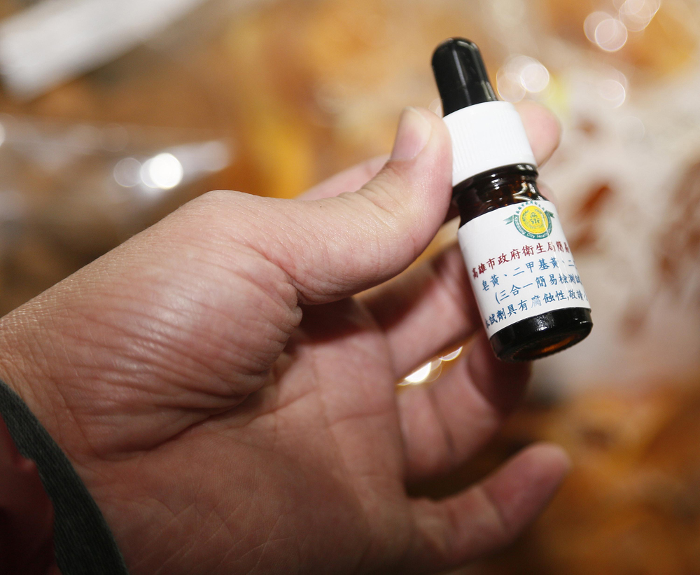 高雄民眾可至衛生局索取「三合一」簡易檢測劑,可同時檢測二甲基黃、二乙基黃及皂黃3種工業染料,若滴下後沒變色就OK,若變紅就可能含工業染料,可向衛生局檢舉 中央社