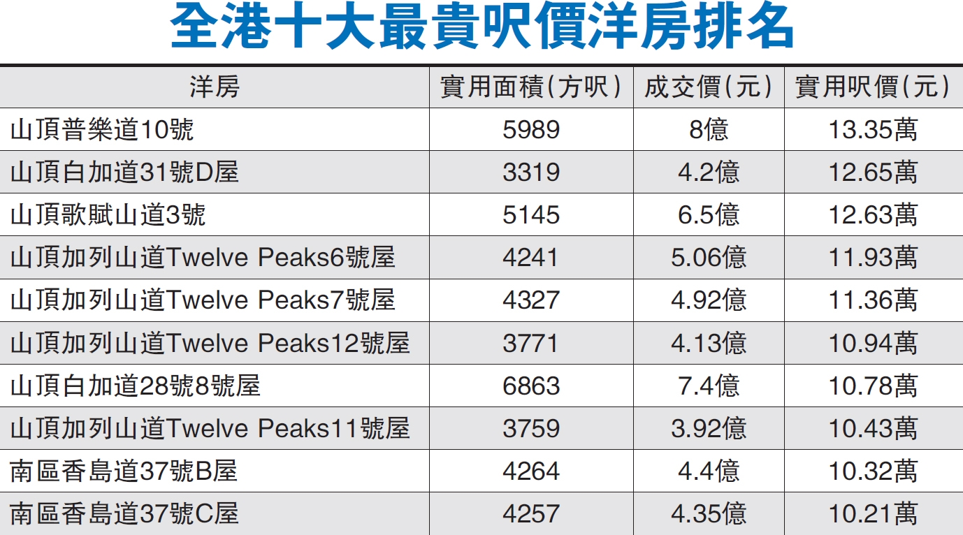 呎價12萬全港洋房次高