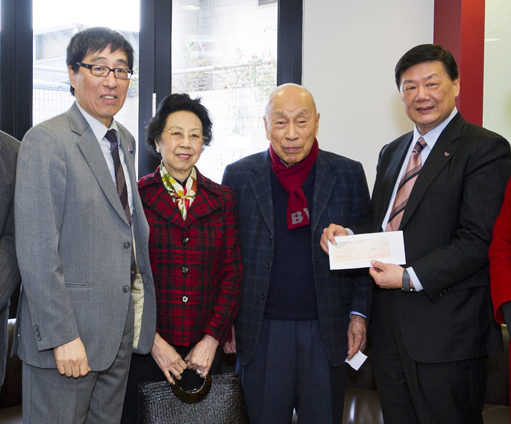 圖左起:郭位、李達三夫人、李達三和胡曉明,舉行一億港元支持城大獸醫學院支票接收儀式