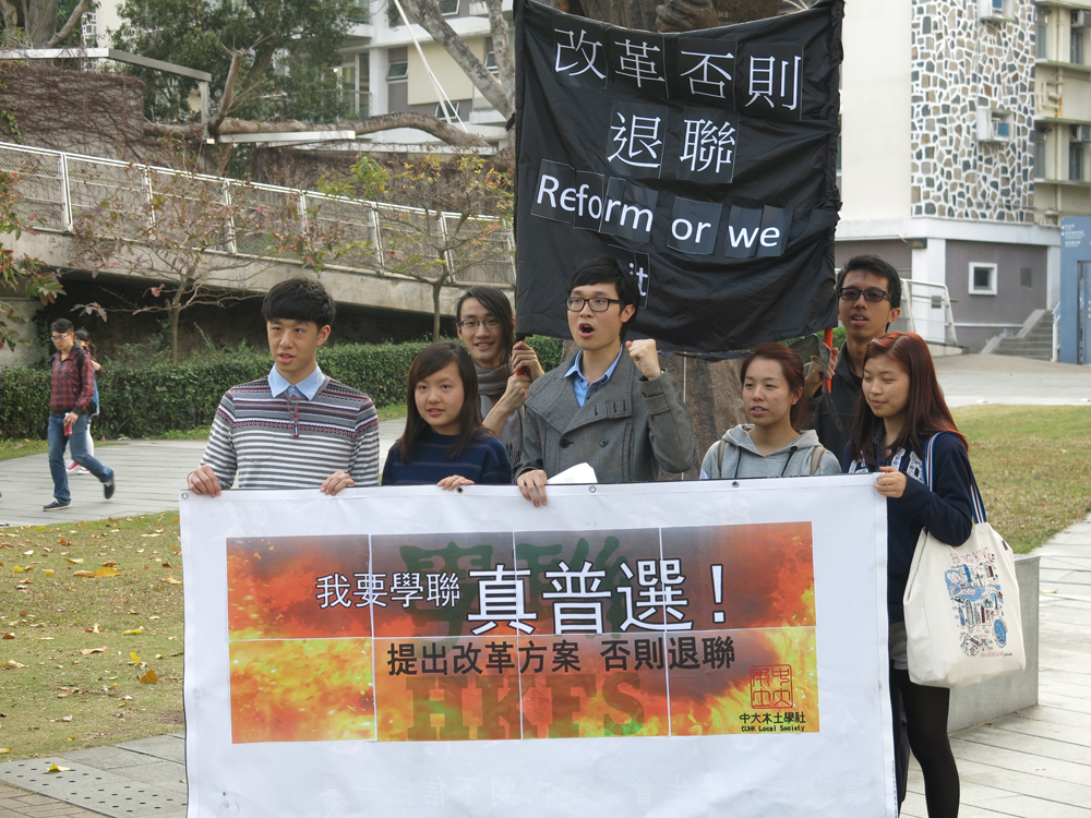 「中大本土學社」昨日在校園舉行記者會,要求學聯一個月內提出改革方案,由全體大學生普選出秘書長,否則在下個月發動「退聯」公投,題目暫定為「若2016年香港專上學生聯會秘書長並非由全體會員提名及普選產生,香港中文大學學生會必須退出香港專上學生聯會。」學社批評,學聯秘書處由多重間選產生,令學聯核心與學生距離甚遠,亦因此毋須直接向會員問責。此外,學聯中人在港大「退聯」後仍未有檢討自身,提出實際改革方案安定民心,反而有學聯「老鬼」在網上以粗言穢語批評退聯支持者。