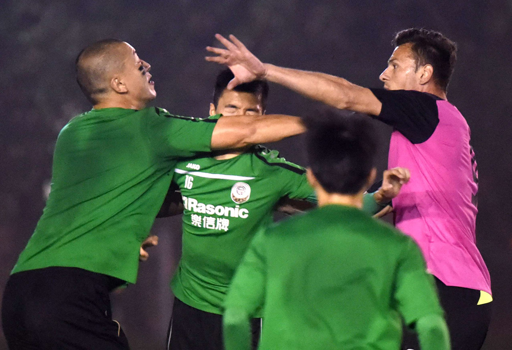 圖:公民球員王悅(左)在衝突中向太陽飛馬的拉斯錫(右)揮右拳 /本報攝
