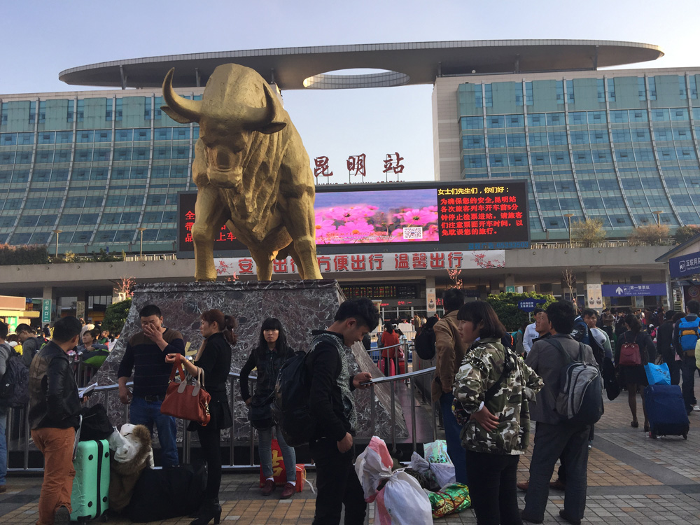 圖:昆明火車站的雕塑銅牛前,曾經是群眾自發悼念去年暴恐案死者的主要場所 大公報記者蓮子攝
