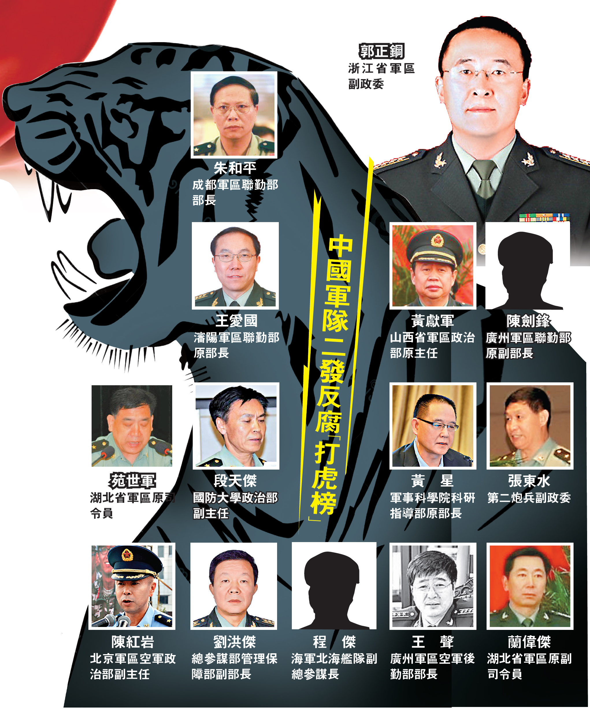 □兩會前夕,軍隊權威部門2日再發「打虎榜」,公布近期查處軍級以上幹部重大案件情況信息,共計14位少將落馬,包括原中央軍委副主席郭伯雄之子、浙江省軍區副政委郭正鋼,第二炮兵副政委張東水等等。加之上輪16名落馬將領,軍隊已成打虎重點領域。【大公報記者馬浩亮北京二日電】