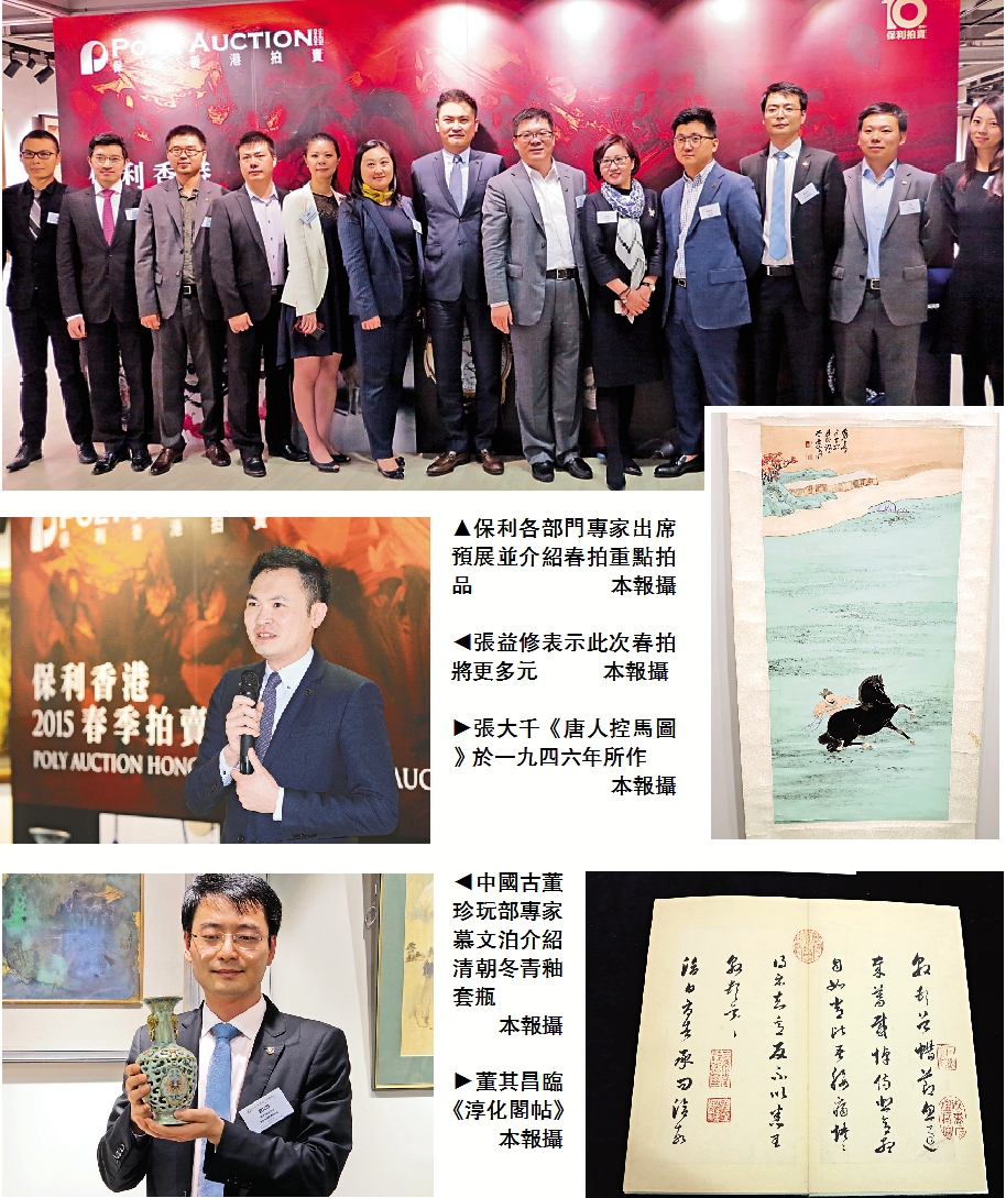 【大公報訊】實習記者卞卡?報道:保利香港二○一五年春季拍賣會,將於四月六及七日在香港君悅酒店舉行,預展日期為四月四及五日。此次春拍將呈現十二個專場,二千三百餘件作品,總估價約八億港元。