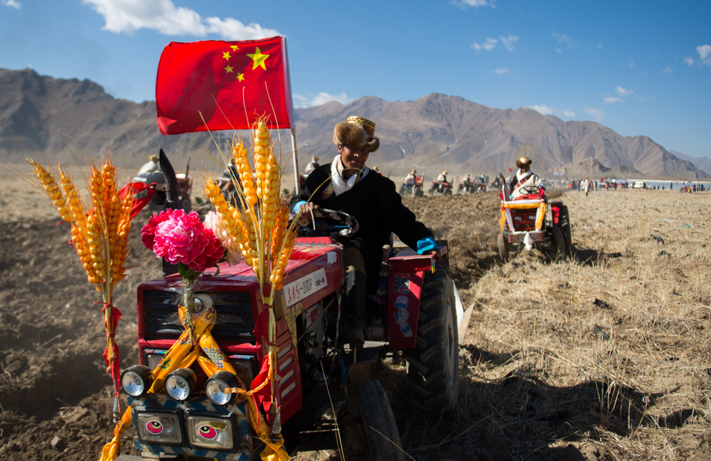 3月16日,手扶拖拉機手在拉薩市達孜縣幫堆鄉的春耕儀式上犁地。按照藏曆傳統,當日是西藏高原春耕第一天,當地農民身?節日盛裝,舉行春耕儀式,開始撒種,祈福一年的豐收。 新華社