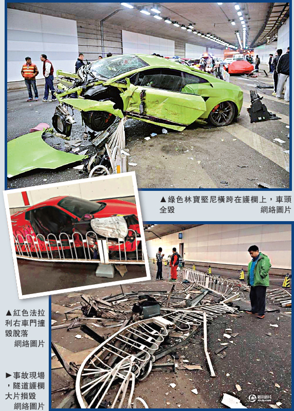 事發隧道長約1.2公里,一段長約150米的護欄在事故中已經被兩輛車碾軋嚴重損壞,一段長約16米的隧道北側防火板牆皮被撕破,牆內骨架、電纜線損壞。事故現場,紅色法拉利車頭嵌在路中間的隔離欄,左車門有切口,右側車門脫落。十幾米外,綠色林寶堅尼車頭完全撞毀,架在隔離欄上,車旁還散落?一隻黑色的高跟鞋。據目擊者回憶,事發時有7、8個年輕人在現場對?這幾輛車束手無策,也有的忙?打電話。