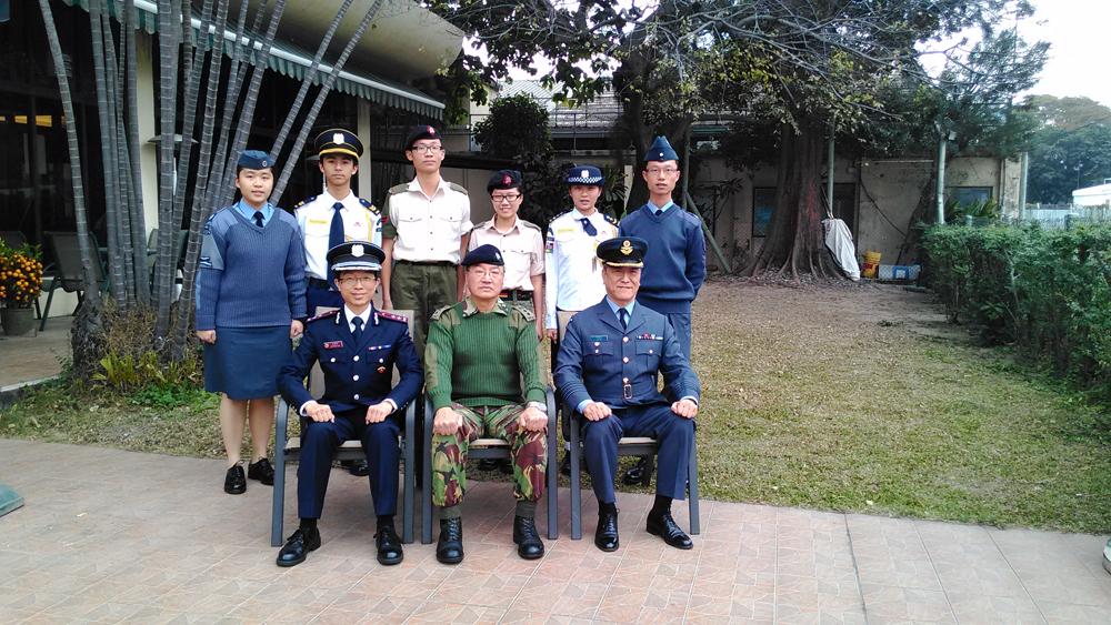 圖:制服團隊隊員及領導合照。前排左起:升旗隊總會總監許振隆、香港少年領袖團上校鮑志良、航空青年團上校李國榮/大公報記者黃穎雅攝