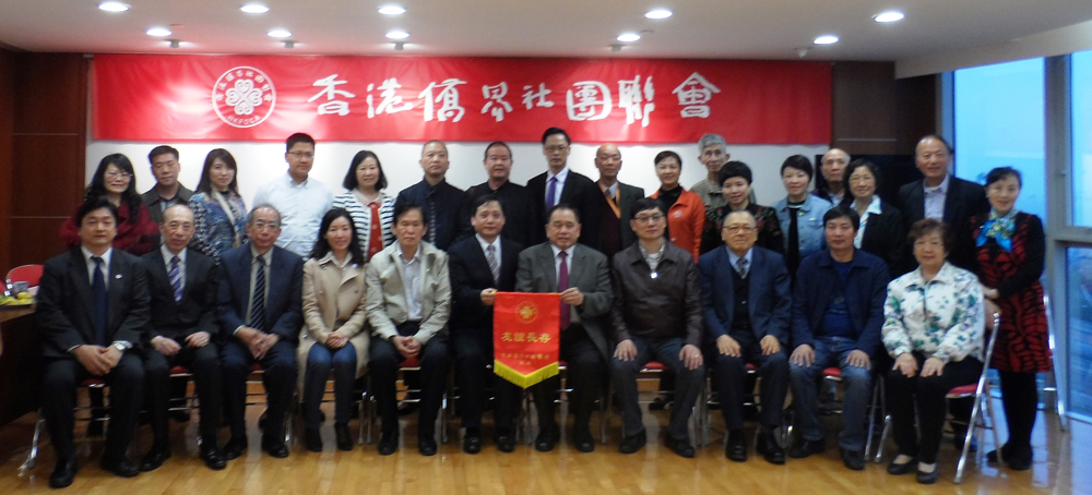 圖:余國春(前排左七)代表港僑聯會致贈紀念品,孫民生(前排左六)等接受