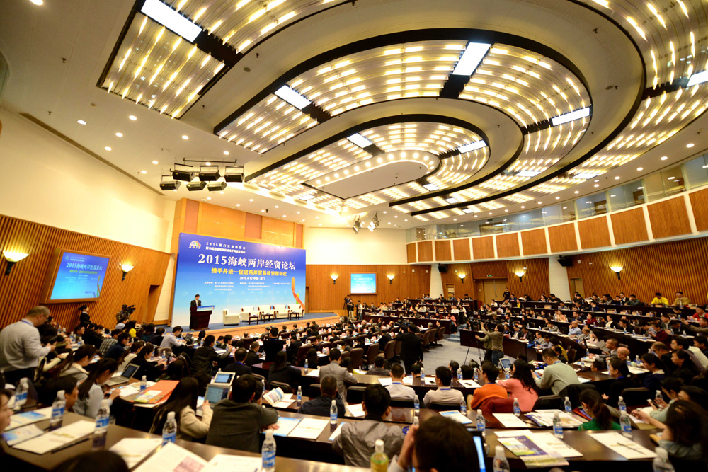 圖:首屆「廈門工業博覽會暨海峽兩岸機械電子商品交易會」12日在廈門會展中心開幕。圖為廈門「工博會」上舉辦的2015海峽兩岸經貿論壇會場/王東明攝