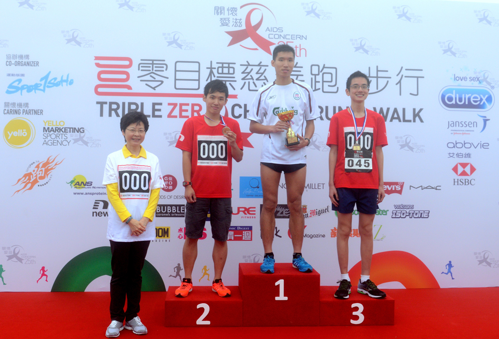 圖:政務司司長兼「關懷愛滋」贊助人林鄭月娥除於典禮上致辭外,亦頒發了男、女子個人組別(18至29歲)的獎項。(左起)政務司司長林鄭月娥、男子個人組別(18至29歲)亞軍關冠傑、冠軍麥建升及季軍許權堯。