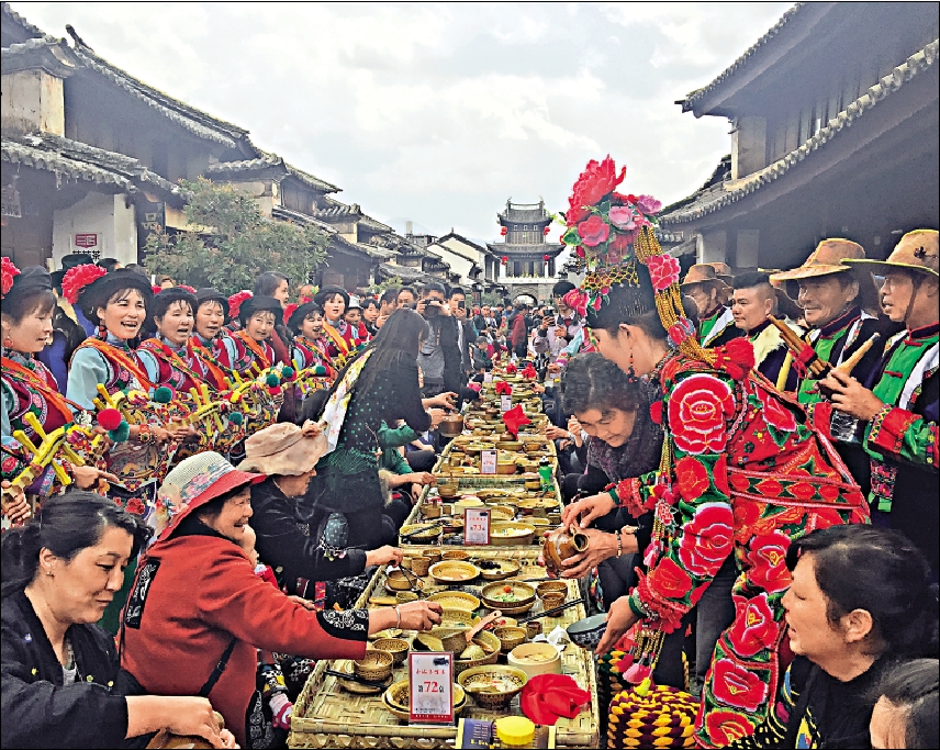 圖:巍山「小吃節」,南詔古街養生宴從街頭擺到街尾,彝族盛裝唱起酒歌