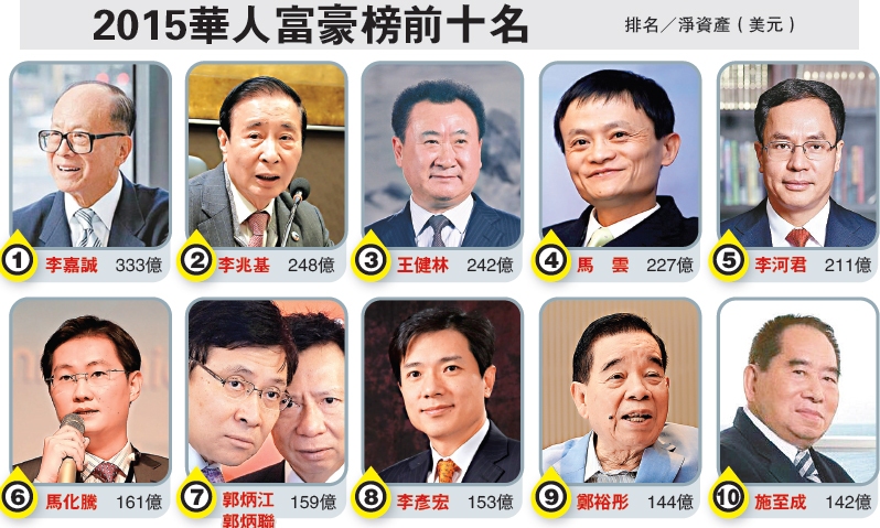 《福布斯》發布2015華人富豪榜,長和系主席李嘉誠以淨資產規模333億(美元,下同)(約2597億港元),再次蟬聯華人富豪榜第一,全球排名第17位,財富較去年增長7.42%。而去年靠銀娛(00027)股價大升躋身第二位的呂志和,其身家今年大跌85億元至第十二名,位置則由恒基地產(00012)主席李兆基以248億元身家取代。李兆基財富按年增長26.53%。第三位為中國內地富豪、大連萬達集團創始人暨董事長王健林,淨資產242億元,同比增長60.26%。李嘉誠昨日出席長和系「世紀大重組」股東會後被問到蟬聯華人富豪榜第一的感受時說:「富貴不是人家講多少,最重要心中富貴!」又指若有人超越他成為首富,他更高興!