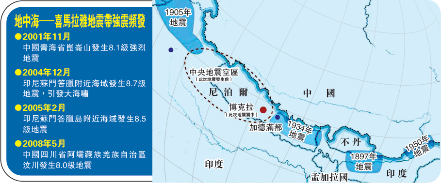 【大公報訊】據《紐約時報》27日消息:2500多萬年前,印度還是一個快速移動板塊上的獨立島嶼,它跟亞洲大陸發生了碰撞。這兩個板塊的互撞目前仍在繼續,每年以約3.8-5厘米的速度相互擠壓。這些能量讓喜馬拉雅山脈形成世界最高的山峰,並導致尼泊爾和周邊地區一直是地震雪崩的多發區,每75年即可能發生大震。