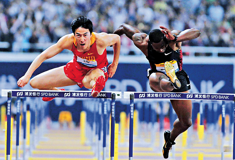 圖:這是二○一一年國際田聯鑽石聯賽上海站,劉翔(左)在男子百一米欄奪冠的資料圖片\中新社