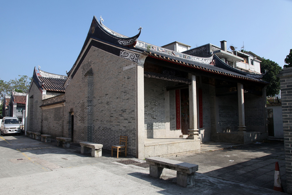 比顯承堂早十年建成的明德堂,同樣是兩進式,但未獲評級。該祠堂歡迎遊人入內,可見兩房子孫對祠堂的開放有不同看法。廖萬石堂是法定古蹟,獲政府出資保養維修,並有保安員駐守,長年開放,故此最為遊人熟悉。