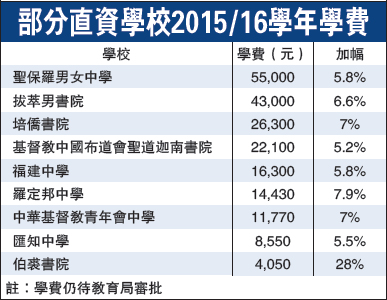 □直資學校申請2015學年加學費上月底截止。教育局公布,全港約70間直資中小學中,40間申請新學年加費,佔直資學校總數超過一半。名校拔萃男書院申請加費6.6%,中一學費擬加至4.3萬元。聖保羅男女中學亦擬加3000元學費至55000元,加幅5.8%,校方指已連續三個學年錄得赤字,不加費將令學校儲備跌穿相等於兩個月的營運開支。\大公報記者 胡家齊