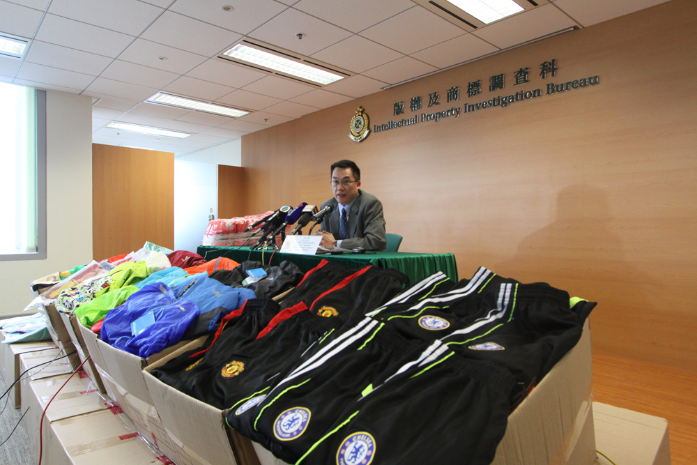 圖:海關展示在過去一星期檢獲的大批懷疑冒牌運動服