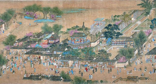 仇英是明代代表性畫家之一,與沈周、文徵明和唐伯虎被後世並稱為「明四家」、「吳門四家」。這件仇英版《清明上河圖》是至正文博集團早年耗費巨資購得,作品是仇英參照張擇端《清明上河圖》這幅名畫的構圖形式,以明代蘇州城為背景,採用青綠重彩工筆,所創作的一幅全新畫卷,風格與張擇端《清明上河圖》迥異。