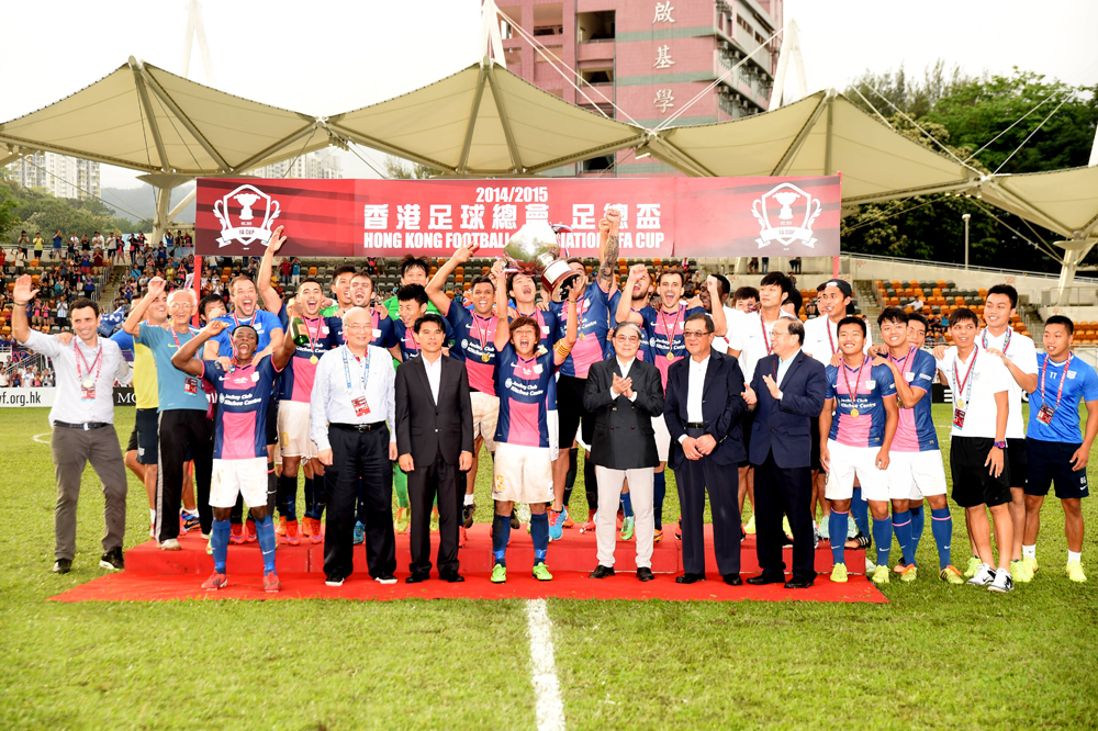 圖:傑志喜奪足總杯,成為首個港超賽季「三冠王」,足總會長霍震霆(前排左五)昨主持頒獎 /本報攝