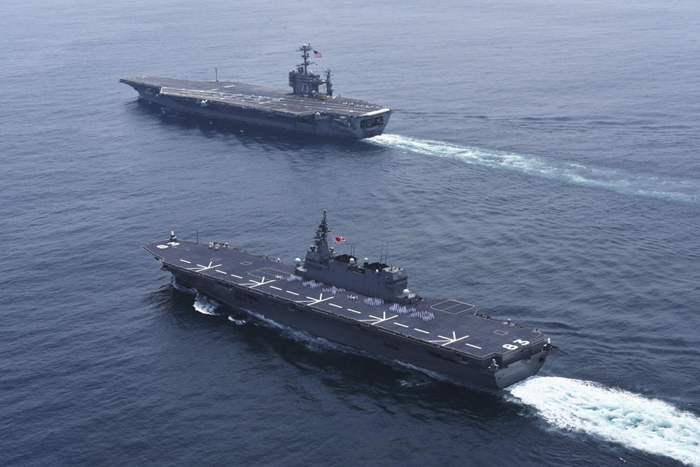 圖:日本「出雲」號護衛艦(下)18日送別「喬治華盛頓」號  /路透社