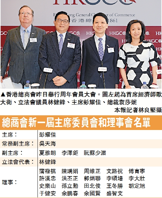 總商會於昨日傍晚召開周年會員大會,隨後新理事會即舉行首次會議,選出正副主席。怡和管理有限公司董事及置地控股有限公司行政總裁彭耀佳連任主席(詳見表)。他在大會上致辭時指出,去年環球貿易增長放緩,以及發生佔領行動,令不少本港企業和市民受影響。他又指,政改討論必須以基本法、全國人大常委會決定及「一國兩制」為出發點,希望政改工作不會受拒絕妥協的人阻撓。