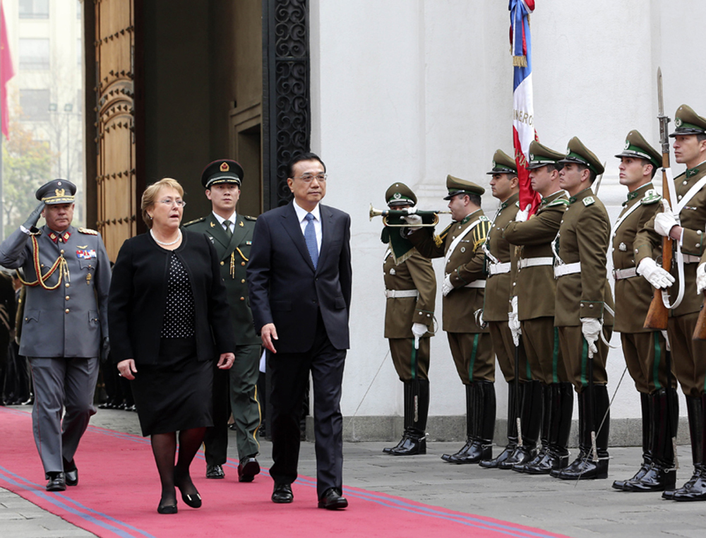 圖:當地時間25日上午,智利總統巴切萊特在聖地亞哥總統府,用「兩場檢閱儀式」歡迎李克強總理 中國政府網