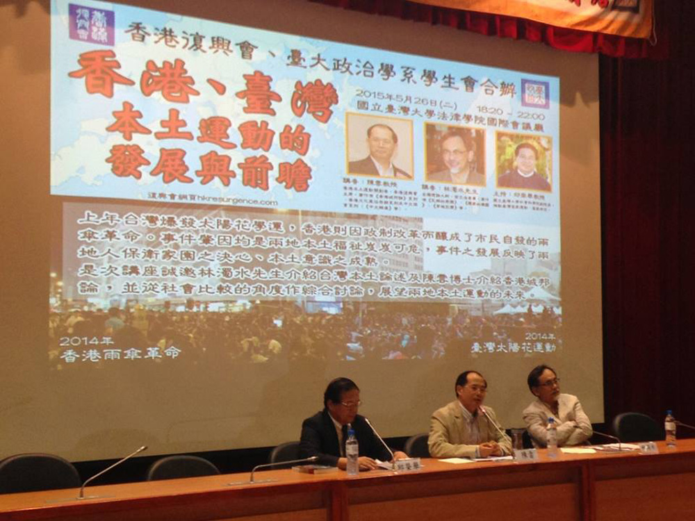陳雲周一以「香港復興會」主席名義赴台,期間與各個鼓吹「台獨」的知名人士見面,並舉行多場講座,其中昨晚與「台獨理論大師」林濁水的講座最為注目。雖然該講座聲稱由「香港復興會」與「台大政治學系學生會」合辦,但當本報向該校學生會查詢時,負責人稱主辦方為「香港復興會」,意指陳雲主動拉攏兩「獨」勢力合流。