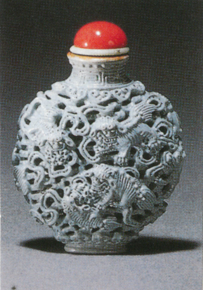 例如附圖,乃清代中期嘉慶年間官?燒造的玲瓏雕瓷鼻煙壺。「玲瓏」也者,猶如玉石竹木的透雕藝術;表面看來,好比鏤空而成的紋飾,圖案或圖畫。根本上是瓷胎雕鏤後,細密上釉,再依嚴格程序燒成,難度高且複雜。清代中期不論官、民?器。幾乎全屬單色釉,以白釉者最多。如圖的淡灰藍釉單色(壺鈕為珊瑚製成),與深藍單色者同樣較少見。其實至清末民初以後,始發展至黃、紅、綠等一器多色之彩色玲瓏瓷。近仿乾隆、嘉慶年款的偽品。孔眼幾全用機械戳製,並非手工刻鏤;只要細察比較,則可分辨。