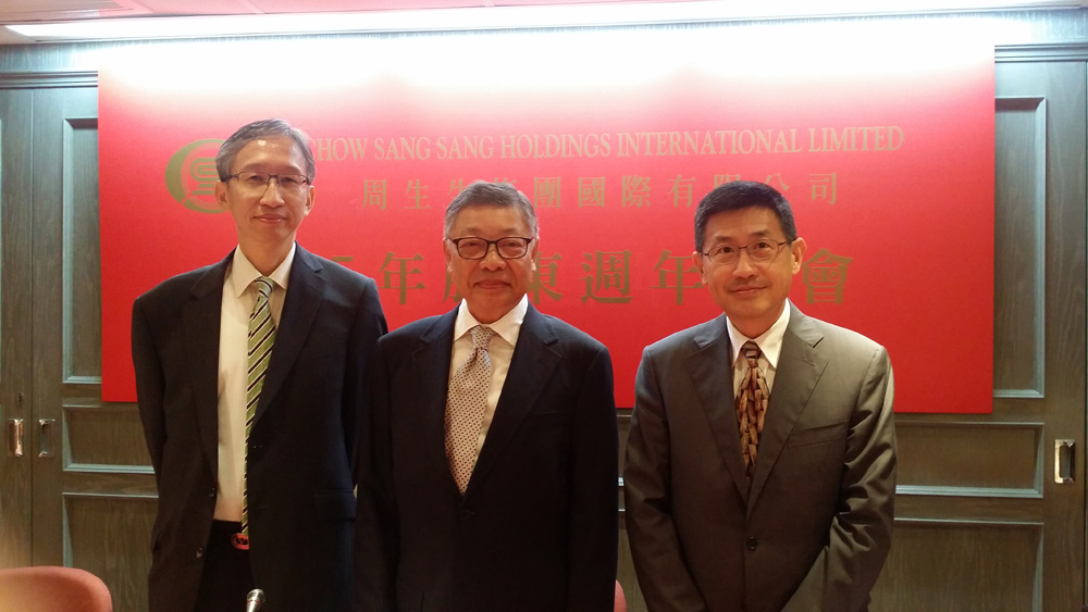 圖:周生生首席財務長譚承志(左起)、主席兼集團總經理周永成、董事兼副總經理周允成\大公報記者林靜文攝