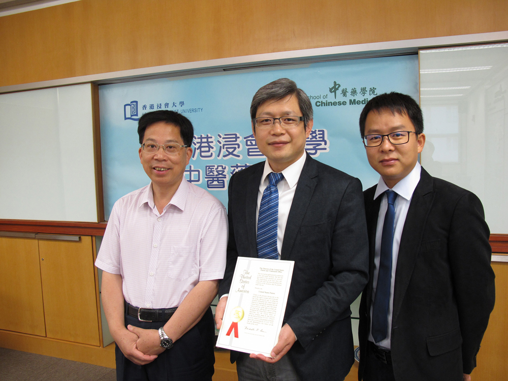 圖:韓全斌(中)與研究團隊成員、中醫藥學院副教授陳虎彪(左)和高級研究助理許軍(右)研發的新鑑別鐵皮石斛方法獲授美國專利\浸大供圖