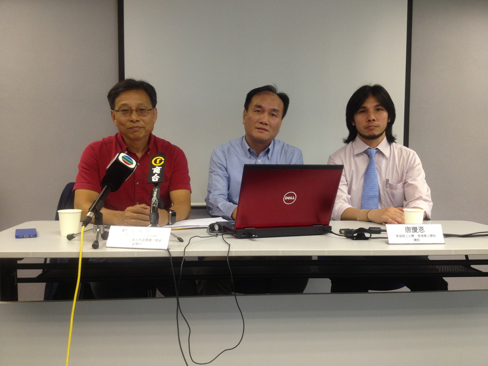 圖:理大土木及結構工程學系副教授熊永達(左)指出,調查反映載客取酬問題嚴重,加上客貨車及「白牌車」未有為乘客購買保險,對乘客欠保障。中為香港的士車行協會會長吳坤成,右為理工大學專上學院講師唐慶恩
