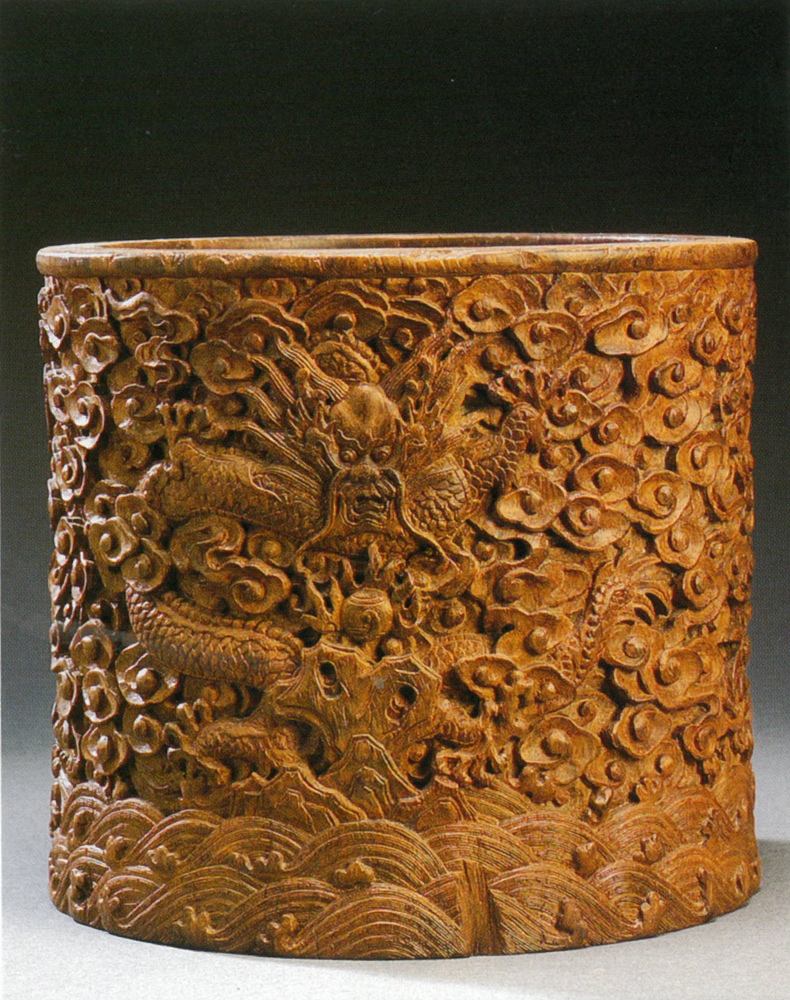 例如附圖,乃清代名家用優質黃花梨木,浮雕龍紋筆筒,雲紋地,下雕波浪紋,鏤刻精妙繁縟;龍形有如晚清金幣上的長鬚龍,應屬清代較後期作品。