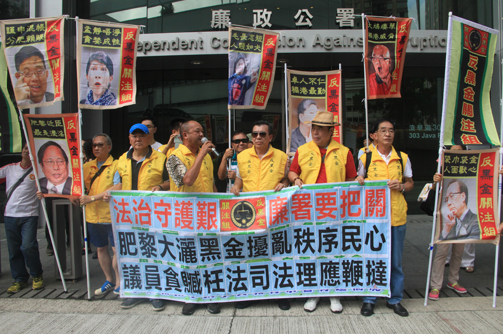 昨午約有廿餘名反黑金關注組成員前往廉署總部示威請願,他們拉起橫額,大叫口號,指反對派收取來自黎智英的「黑金」,進行反政府、反特區、反政改活動。他們認為,早在一年前已向廉署提供充足證據,不過廉署至今仍然毫無行動,示威者稱:「罪犯人贓並獲,為何仍未落鑊」,批評廉署未有嚴肅徹查事件。
