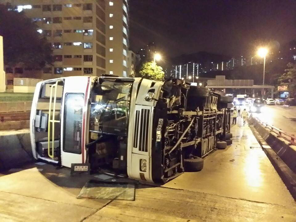 昨凌晨零時許,47歲姓吳司機,駕駛一輛空載正擬回廠雙層巴士,沿龍翔道天橋駛向九龍灣。巴士駛至近彩虹?對開上橋位時,司機報稱閃避切線車輛,巴士突然失控撞向分岔位石壆,繼而衝上龍翔道天橋,衝前約二十米後向右翻側,幸當時鄰線沒有車輛經過,未有遭翻側巴士壓中。吳姓車長未受傷自行爬出車廂。警員接報封鎖路面調查,並替車長作酒精吹氣測試,證實並無飲酒。受意外影響,龍翔道東行線交通出現車龍,約清晨五時許肇事巴士始扶正拖走,待進一步檢驗。